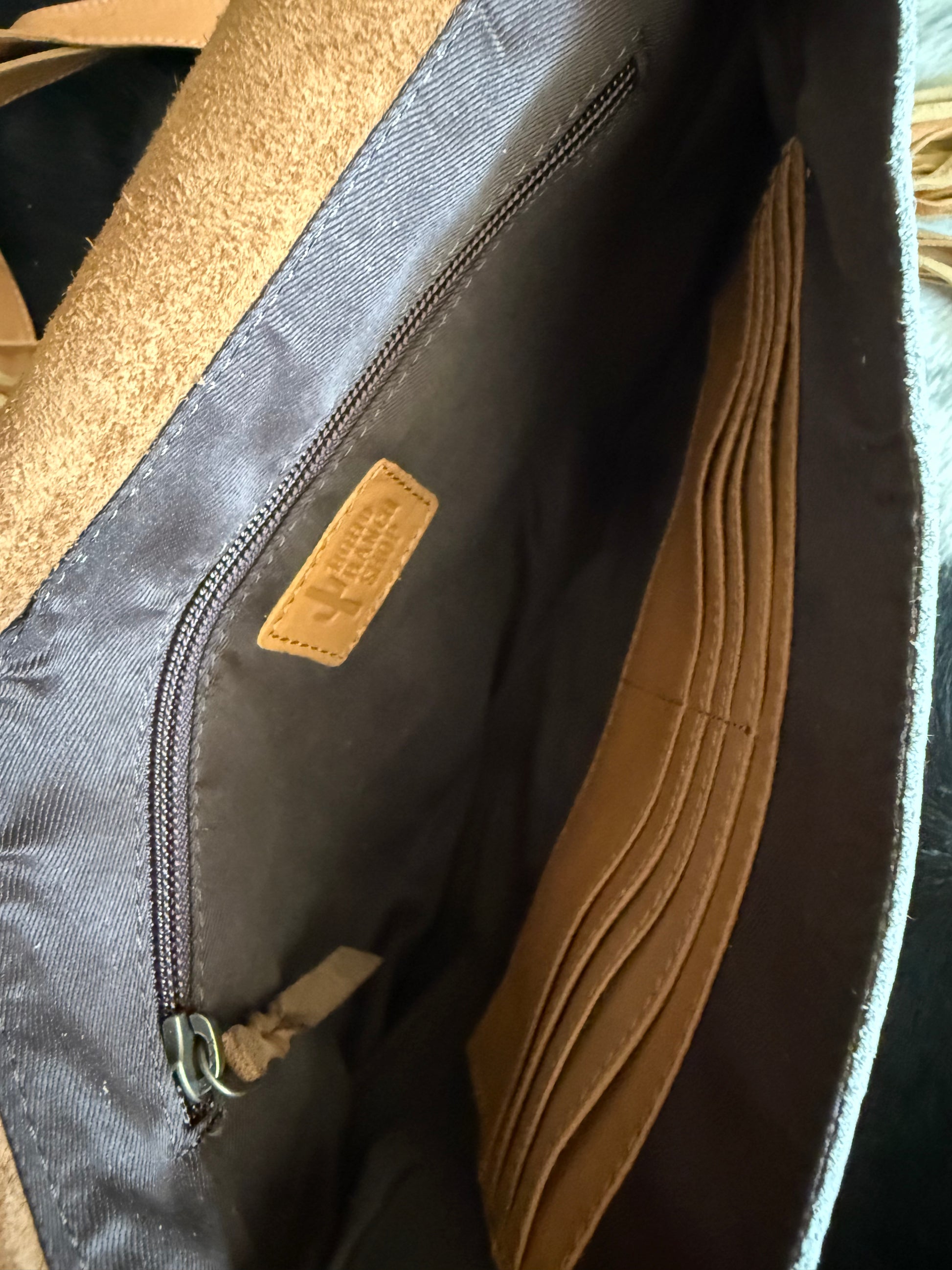 Beautiful hand tooled detail, pink flowers, sassy fringe, and gorgeous cowhide