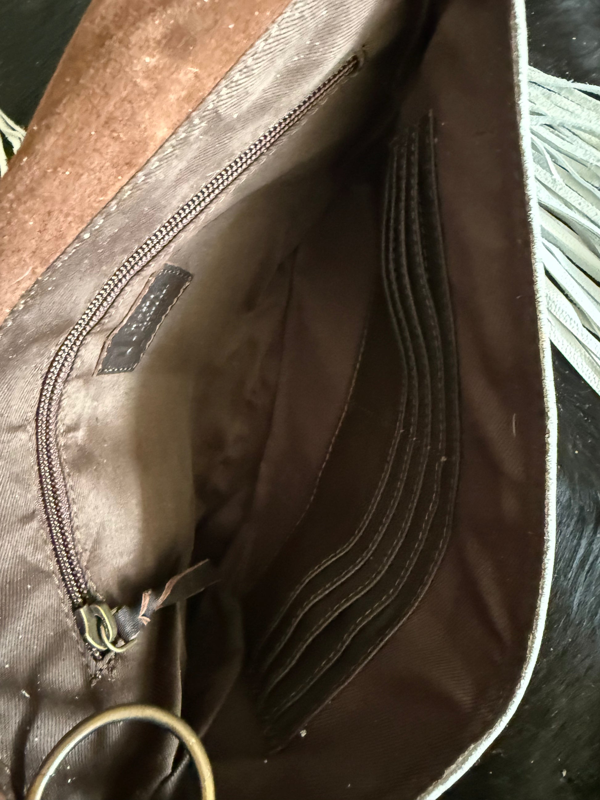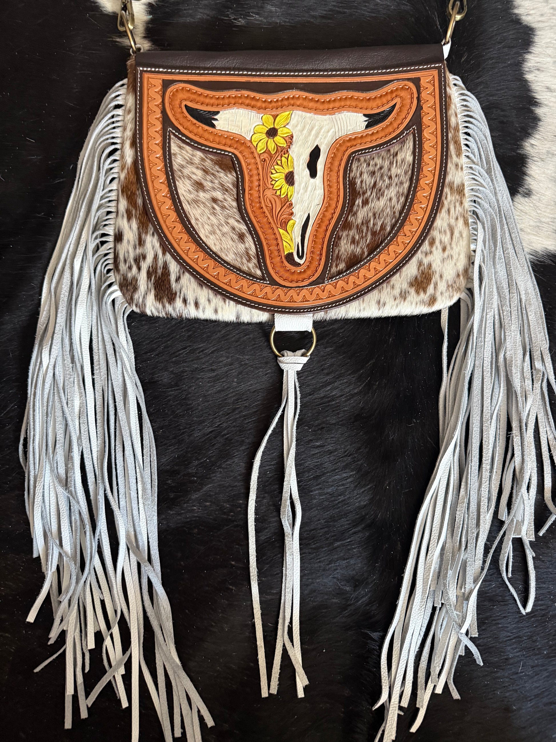 Beautiful hand tooled detail, yellow flowers, sassy fringe, and gorgeous cowhide