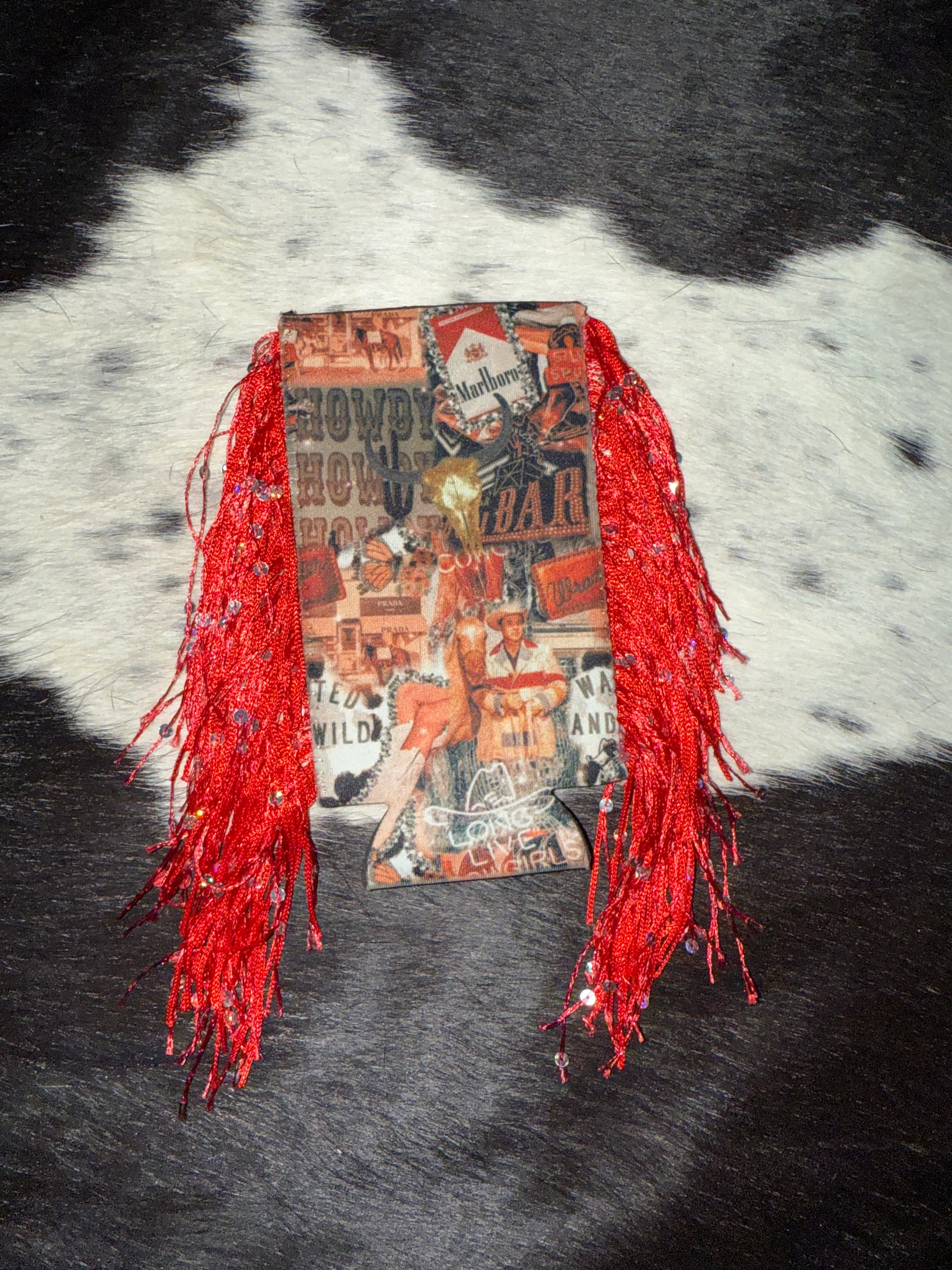 Red Rodeo Slim koozie with red fringe adds a little extra sass