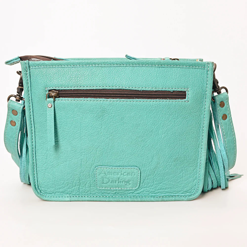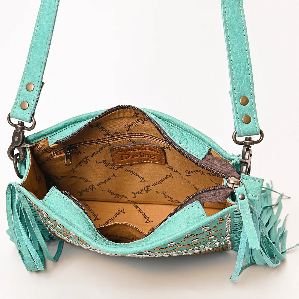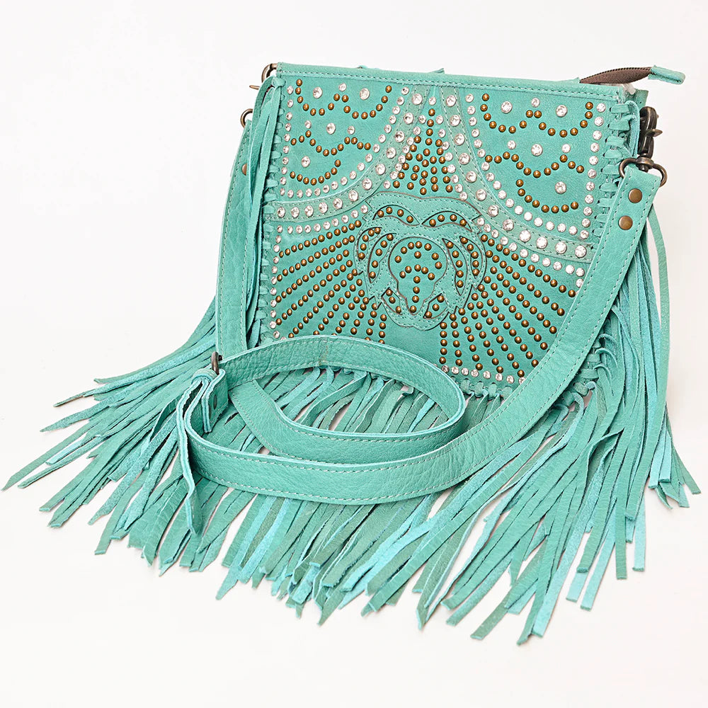 Genuine turquoise-dyed leather with hand studded silver + copper accents.