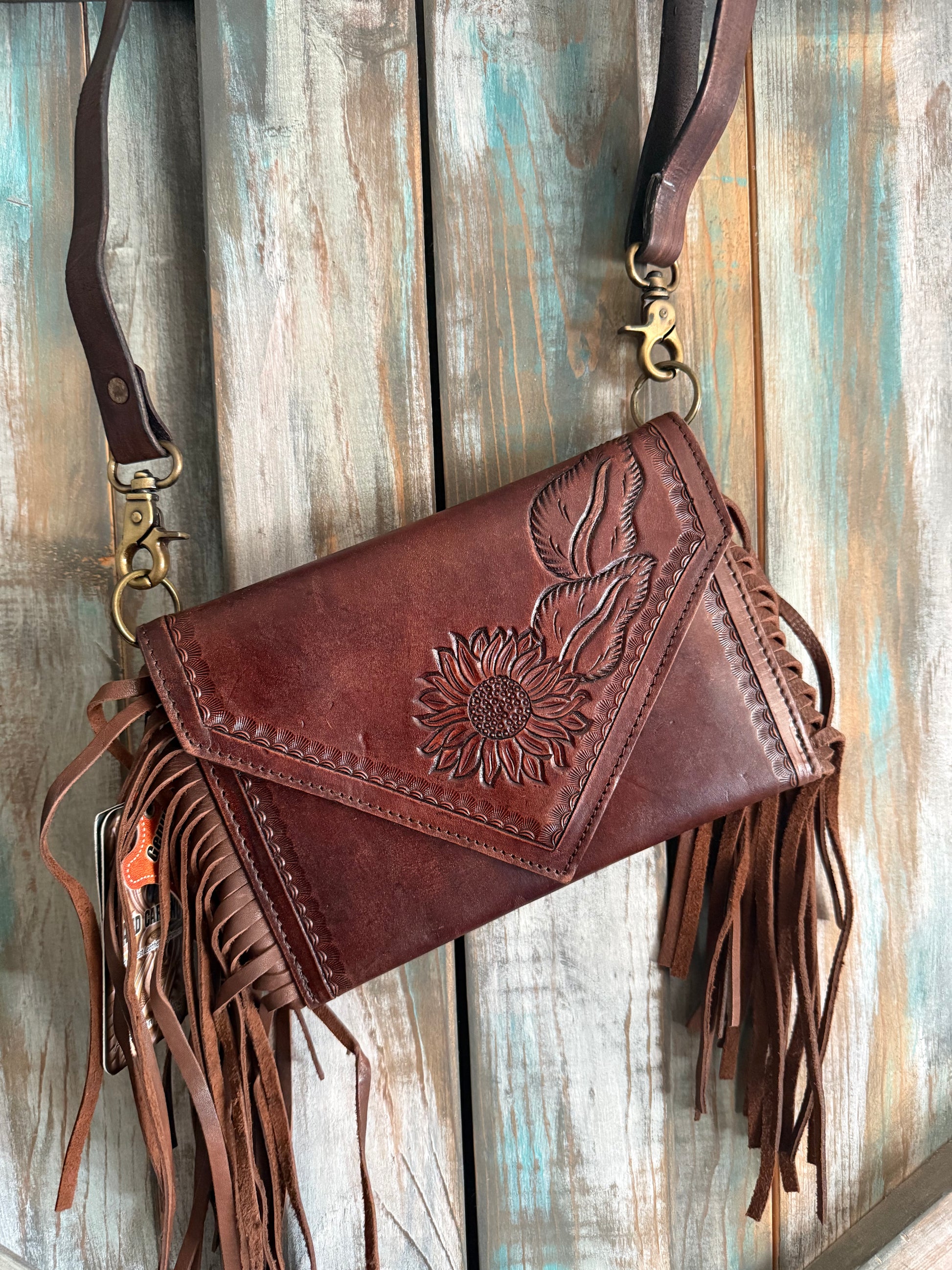 Simple and pretty genuine dark brown leather envelope style crossbody bag. Has a handcrafted sunflower design on front of bag with decorative fringe on both sides.