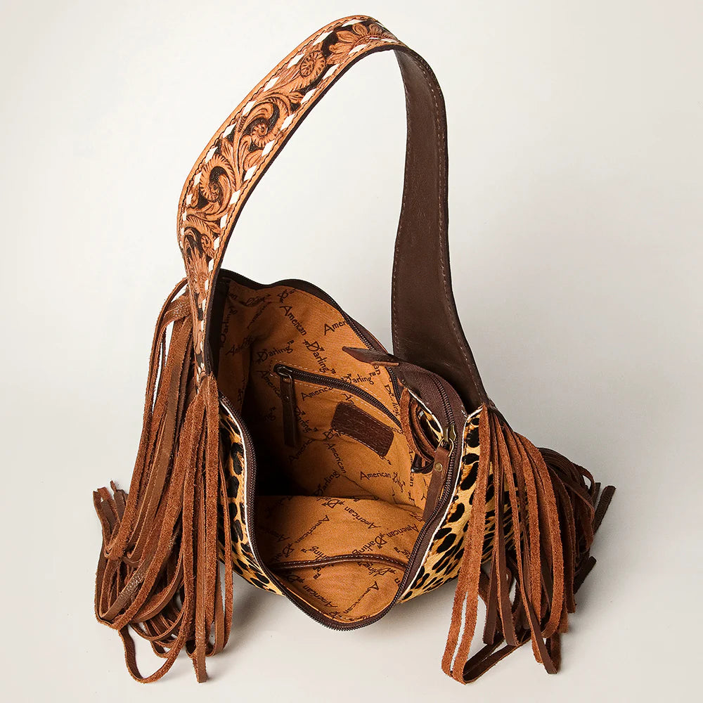 Wild and bold genuine leather hobo bag with fringe down both sides and beautiful buck stitching along shoulder strap.